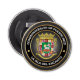The national emblem of Puerto Rico is at the center of a circular design. The background color is a radial black/white gradient, and around the rims of the circles, is a faux gold color. The text on the design features the official title of Puerto Rico, while the bottom text is the motto, which translates as the Isle of Enchantment.