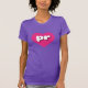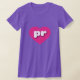 This t-shirt features a vibrant hot pink heart containing bold, rounded, white lower case letters pr, a playful version of the abbreviation for Puerto Rico, the enchanted isle.