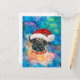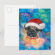 Pug Breed Dog Christmas features a watercolor of a Pug with a red Santa's Hat, a red Christmas Collar, and a galaxy watercolor.