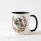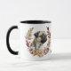 A pretty autumn wreath in tones of cinnamon brown, tan, and cream surround the watercolor image of an adorable little Pug Dog. The image is printed twice on the mug, with your custom text between them.
