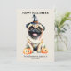 This greeting card features a cute Pug dog wearing a witch hat with little pumpkins. This watercolor design is modern and ready to be personalised. On the back, it says “Pup-kin spice and everything nice,” but this can be changed if desired. It’s the perfect card to send to friends and family during the Halloween season!