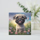 Cute Pug puppy in a field of flowers.