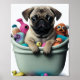 Join this playful Pug as they soak in the suds and unwind in the tub. The cute and quirky design is sure to bring a smile to your face and brighten up any room. Perfect for dog lovers, this charming illustration captures the joy and relaxation of bath time for your furry friend.