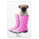 Adorable pug puppy in galoshes