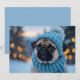 This adorable Christmas card features a cute pug wearing a cosy blue knit hat and scarf, posing against a backdrop of twinkling lights and a snowy landscape. This heartwarming image is perfect for spreading holiday cheer and bringing a smile to the faces of dog lovers and Christmas enthusiasts alike.