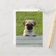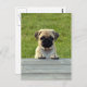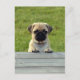 Adorable portrait photograph of a pug puppy peeping over a picnic table.