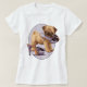 Cute pug puppy dog holding a blue stiletto in its mouth with light blue polka dot background and oval frame, painted by artist Maryline Cazenave.