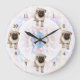 Very unique clock, large size, with four adorable pugs at the 12, 3, 6 and 9 o'clock settings. I added the name of the dog plus the family last name to personalize and make it a lasting keepsake. You will never find a clock of this quality and customization anywhere in the bricks and mortar stores!! The print is perfect in size and color, just as requested. Can't wait to see the recipient's face when they see this precious clock with their precious breed and name attached.!!