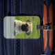 Adorable portrait photograph of a pug puppy peeping over a picnic table.