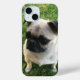 Adorable pug puppy sitting on grass, looking to the side on portrait photograph.