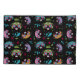 Pug Sugar Skulls Pillowcase Set has a pink pug sugar skull on one and blue pug sugar skull on the other both. Both have a multi-colour pug sugar skull pattern on the back. Black background.