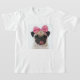 Pug dog with tongue out with a sequined pink ribbon, white background.