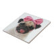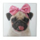 Pug dog with tongue out with a sequined pink ribbon, white background.