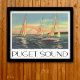 Sailboats on Puget Sound beautiful vintage image with Mt. Rainier in the background in Washington state. The image is rendered in vintage travel poster style with the soft glowing colors and the art deco font for the name below.