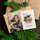 This funny dog-themed Christmas Photo Postcard showcases a wicker basket brimming with holiday delights. Adorned with mistletoe, pine needles, and accented with vibrant red bows, it exudes the enchantment of the holiday season. Within the basket, you'll discover two endearing Pug puppies, their inquisitive eyes aglow with wonder as they embark on their very first Christmas journey. On the left, a special space awaits you and your beloved furry companion. Insert your favourite vertical photo and allow your treasured pet to shine with their irresistible holiday charm. Turn it over, and you'll encounter a designated area for a personalised message.