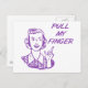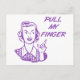 We couldn't resist a classic. A retro style housewife pointing her finger, with the words "pull my finger". Purple and white. Makes a great gift. Printed on t-shirts, gift items and more.