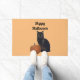 This doormat features a black cat and a pumpkin on a light orange background. "Happy Halloween" is written across the top. You can customise this mat with your own message. You can also replace the photo of the cat and the pumpkin with your own photos if desired. If you need help customising, please contact me.