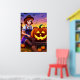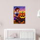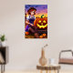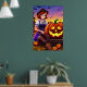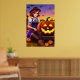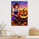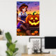 A young lady with short hair with mostly purple clothe and a hat on the head with pumpkin with spooky smiles next to her. This is a AI generated art. Halloween themed art