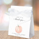 Cute gender-neutral baby shower favour box featuring "thank you" in simple grey typography and a stylish script with swashes, and an orange pumpkin watercolor.