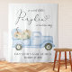 A cute autumn-themed photo backdrop tapestry and welcome sign for your baby boy shower with "a sweet little pumpkin is on his way" in a mix of modern typography and a script with a heart swash, and a watercolor of a blue vintage truck filled with pumpkins. Personalise the mother's name and shower date in simple typography.
