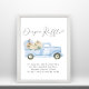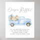 Cute diaper raffle drop off sign for your baby boy shower that features "diaper raffle" in a chic script with a heart swash and watercolors of a blue vintage truck loaded with pumpkins and florals. Easily personalise the diaper raffle instructions in simple grey typography.