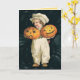 Adorable vintage boy is holding two carved Halloween pumpkins. One is happy and one is sad. Text on pumpkins say Halloween Greetings.