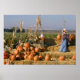 Pumpkin display with hay bales and scarecrows poster