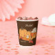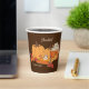 Cute dark brown Thanksgiving paper cups with pumpkins , a slice of pie , an orange mug and some autumn leaves . Personalise them with your text and family's name . Add a lid if you want one .