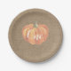 Pumpkin Fall First Birthday Party Paper Plates. Burlap Background.