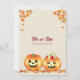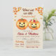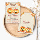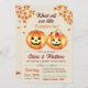 The invitation features orange pumpkins with jack-lantern faces and fall leaves. This design is perfect for a fall-themed gender reveal party.
