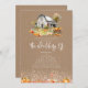 Rustic wedding theme featuring illustration of rustic country farm with barn, leaves and pumpkins. Foliage and pumpkins at bottom. Background is cardstock inspired.