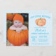 Pumpkin First Birthday Invitation with Blue Background custom photo. Girl Bday Party Invite. 1st 2nd 3rd 4th 5th 6th 7th 8th 9th 10th, Any Ages. For further customisation, please click the "Customise it" button and use our design tool to modify this template.