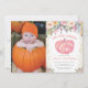 Pumpkin First Birthday Invitation with custom photo. Girl Fall Birthday Party Invitation. Watercolor Floral Flower and Gold Glitter Confetti Background. Pink. 1st First Bday Invite. 1st 2nd 3rd 4th 5th 6th 7th 8th 9th 10th, Any Ages. For further customisation, please click the "Customise it" button and use our design tool to modify this template.