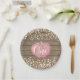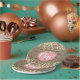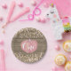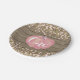Pumpkin Fall First Birthday Party Paper Plates. Pink and Gold Glitter Confetti Background.