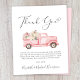 Elegant budget-friendly thank you card for your baby girl shower featuring "Thank You" in a stylish script with a heart swash and watercolors of a pink vintage truck, pumpkins and floral bouquets. Personalise your thank you message in simple modern typography and add your names in a signature-like script.