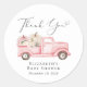 An elegant baby girl shower sticker with "Thank You" in a stylish script with a heart swash, watercolors of a pink vintage truck, pumpkins and floral bouquets and the name of the mother-to-be and shower date in elegant typography.