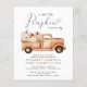 A budget-friendly gender-neutral baby shower invitation that features "a sweet little pumpkin is on its way" in a mix of modern typography and a stylish script with a heart swash, and watercolors of a vintage orange pickup truck filled with pumpkins and floral bouquets. Personalise the mother's name in simple terracotta typography. Specify the baby’s gender if desired (e.g., "is on his way").