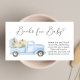 A cute enclosure card for your autumn baby boy shower with "Books for Baby" in a stylish script with a heart swash and a watercolor of a blue vintage truck carrying pumpkins and florals. Personalise the book request in simple soft grey typography.