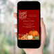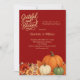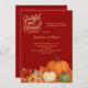 A terracotta, burnt orange coloured background. Decorated with pumpkins and orange and yellow flowers. Personalise and add the party details.