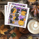 Cute black cats amongst pumpkins, halloween candy, bats, broom, stars, candy corn, acorns, full moon, autumn leaves and a cut ghost all set in a backdrop of light purple