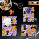 Cute black cats amongst pumpkins, halloween candy, bats, broom, stars, candy corn, acorns, full moon, autumn leaves and a cute ghost all set in a backdrop of light purple