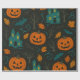 A festive Halloween design featuring glowing jack-o’-lanterns, eerie haunted houses, swirling bats, and autumn leaves. Bare trees and teal swirls add a mystical touch, creating a spooky yet playful atmosphere perfect for seasonal wrapping paper, décor, and craft projects.