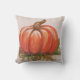 This watercolor illustration features a fresh pumpkin in the sun on a bed of leaves.
