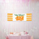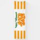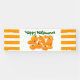 Cute digital drawing of various sized and shaped pumpkins with a fabric effect. The sides have orange and white horizontal stripes. In shades of orange and green on white, this design will be fun in the fall. This lovely banner is perfect for Halloween, Thanksgiving or fall wedding, birthday, or other events. Text reads, "Happy Halloween" and may be customised.