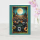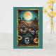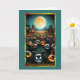 This Halloween card features a spooky and festive scene under a glowing full moon. In the foreground, a gathering of carved pumpkins, each with a unique and eerie face, seems to come to life. The pumpkins have animated expressions, ranging from mischievous grins to sinister stares, adding a playful yet spooky atmosphere. The background showcases a haunting landscape with dark silhouettes of trees and old, mysterious houses with glowing windows, adding to the eerie ambiance of the night.