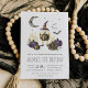 Adorable Halloween birthday party invitations are perfect for your little one's spooky birthday celebration! Cute design features a gnome in a wizard hat, surrounded by carved pumpkins, hay bales, bats, and a crescent moon. Personalise with your Halloween birthday party details beneath in black and purple lettering.