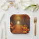 Paper party plate features beautiful AI rendered digital art of a colourful pumpkin path in an Autumn forest. Perfect for Thanksgiving, Halloween and other Autumn gatherings.