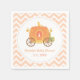 Cute, elegant and classy paper napkins as baby shower supplies to celebrate the arrival of a baby princess! Design features an orange pumpkin princess carriage inspired by the fairytale, Cinderella. Pastel orange and white chevron zigzag pattern for background. Colour palette of orange, yellow, brown and green makes this great for babies arriving in the autumn fall period. Personalise with message within space in stitched circle border.