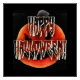 This graphic drawing, has been photo-edited, to enhance, this Menacing, pumpkin image grinning, in orange, yellow, black, and grey, colours-Happy Halloween, Emblazoned, across the front, in macabre, white lettering.