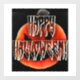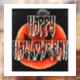 This graphic drawing, has been photo-edited, to enhance, this Menacing, pumpkin image, grinning, in orange, yellow, black, and grey, colours-with Happy Halloween, Emblazoned, across the front, in macabre, white lettering.